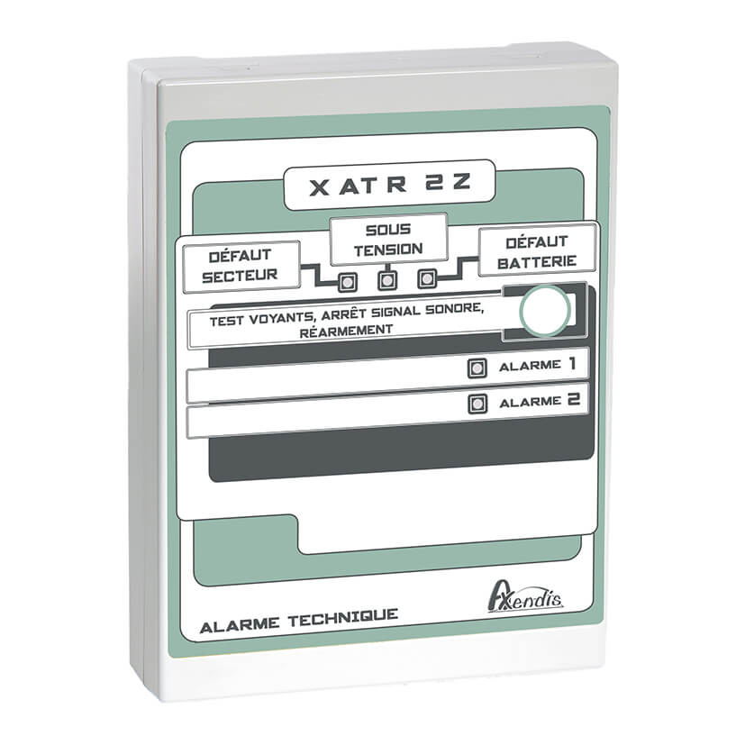 Axendis alarme technique compact permettent la signalisation visuelle et sonore d’une alarme en provenance d’un contact libre de potentiel Normalement Ouvert ou Fermé. Un voyant lumineux spécifique indique le dérangement éventuel de l’alimentation secteur ou batterie. La face avant du produit permet d’inscrire les libellés des zones ou alarmes reportées.