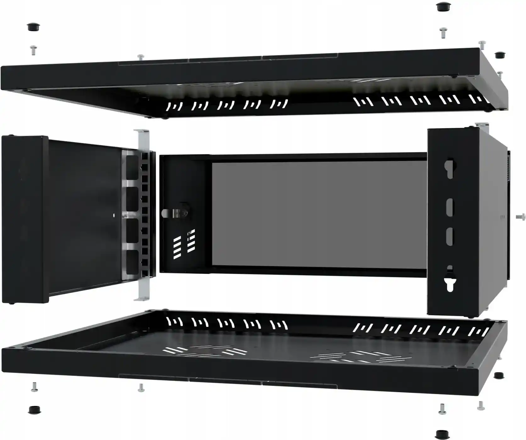 L’armoire se fixe aisément au mur grâce aux trous arrière et aux chevilles (non fournies), offrant une stabilité optimale via quatre points de fixation. La porte peut être montée à droite ou à gauche et les charnières à ressort permettent un montage et un démontage rapides. Les rails RACK sont réglables sur trois profondeurs, offrant une grande flexibilité pour l’installation de l’équipement.