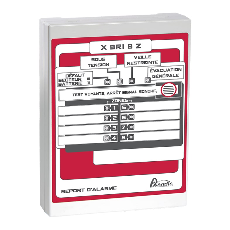 Les boîtiers de report d’alarme incendie 4 zones (10530) et 8 zones (10590) permettent de recevoir à distance la signalisation visuelle et sonore des informations en provenance des blocs autonomes d’alarme sonore principaux de marque Axendis : BAAS PR4, 4 Zones 11551 et BAAS PR8, 8 Zones 11561.