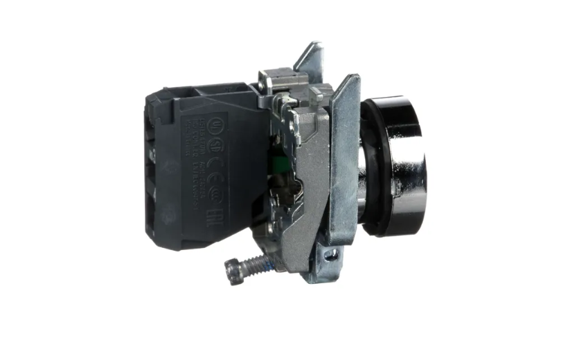 Ce bouton poussoir noir, à impulsion, de la marque Schneider Electric, est un dispositif servant à actionner