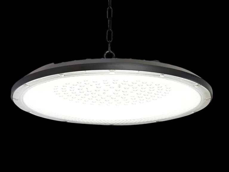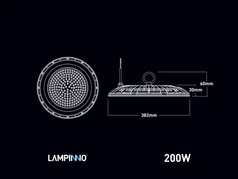 200 watts SMD LED UFO Highbay Slim Waterproof 4000K – flux lumineux 20000 lumens – couleur de lumière blanc neutre 4000K – étanchéité IP65 – avec lentille – angle de faisceau 90° – couleur du produit noir – Ø 382 x 30 mm – matériau aluminium et lentille PC – kit de montage non inclus – durée de vie 25 000 heures – tension 220-240 V – PF > 0,9 – IRC > 80