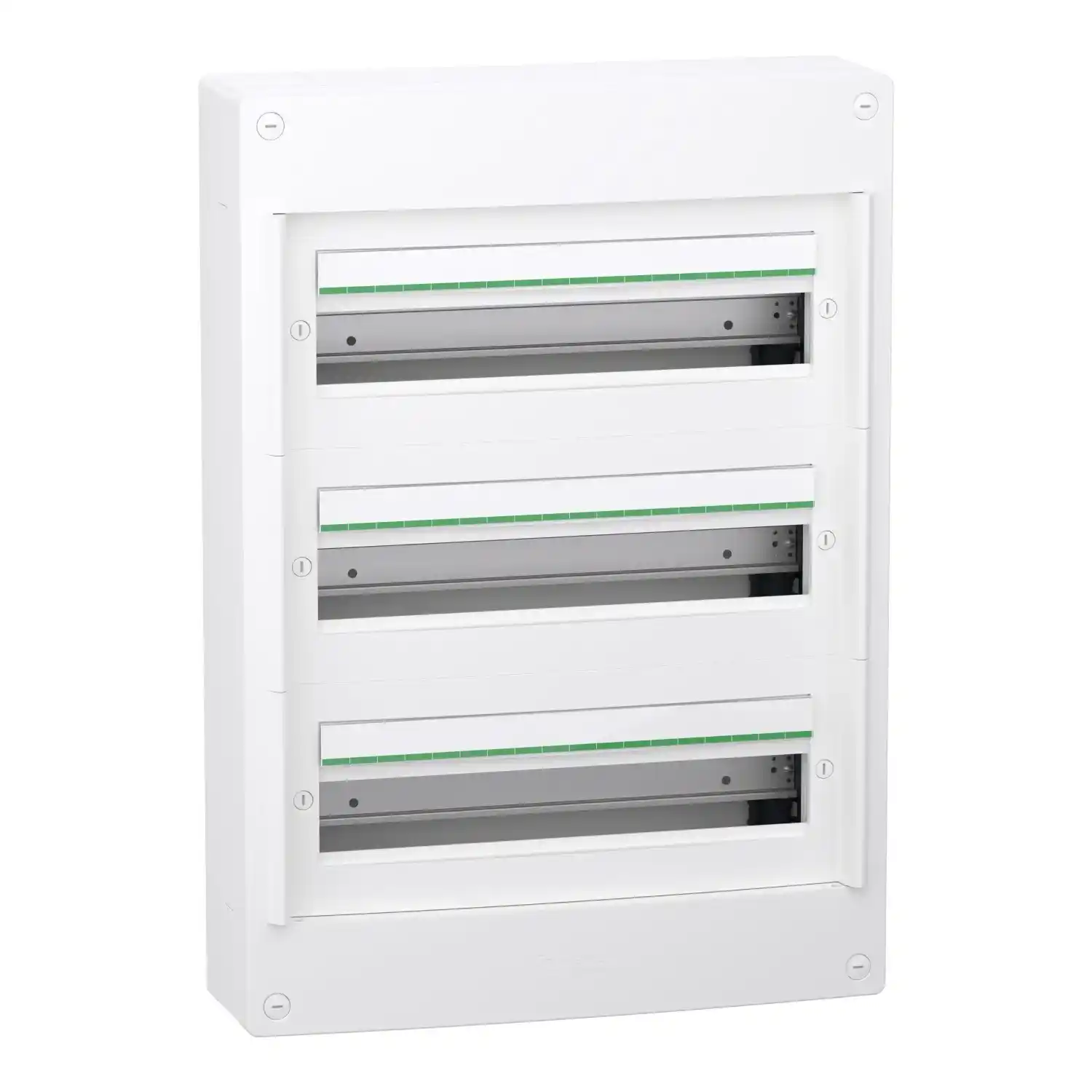 Ce coffret PrismaSeT XS est un coffret en saillie de distribution électrique, en plastique, composé de 3 rangées de 18 modules de 18mm, avec des degrés de protection IP30 et IK08 sans porte. Il peut accueillir tous types d’appareillages modulaires. Compatibles avec nos produits embrochables (XE), ce coffret est dédié à une installation en intérieur et est destiné aux secteurs résidentiel et tertiaire. Le coffret, le plastron et la porte de couleur blanche (RAL 9003) rendent plus esthétique vos équipements. La classe d’isolation électrique est de classe II.