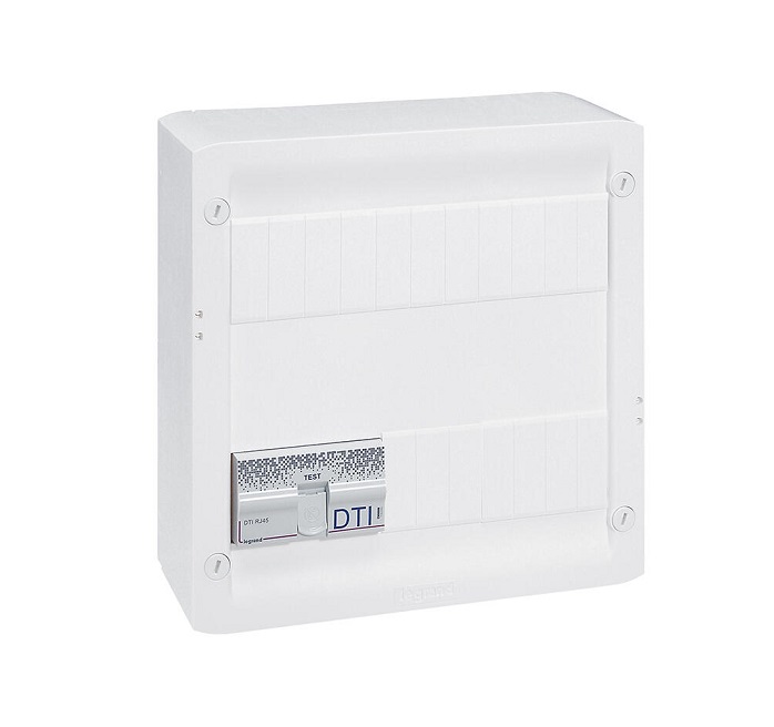 • Composition :- 1 coffret Drivia 13 modules- 1 DTI RJ45 modulaire qualifié par Orange- 6 départs téléphone- 1 répartiteur TV 4 sorties- 1 bornier de terre