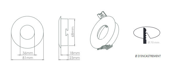 Fabriqué en aluminium avec une finition très élégante. Son installation est très simple et ne nécessite qu’une découpe de Ø70 mm dans la surface où il sera encastré.