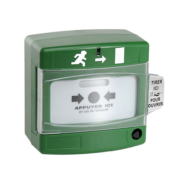 Le déclencheur manuel (DM) vert est utilisé pour forcer l’ouverture immédiate de porte automatique d’issue de secours.
