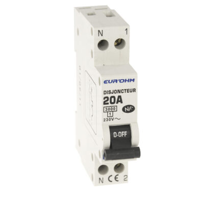 Disjoncteur 32A – courbe C – connexion à vis – 1P+N – NF – 20232, Ce disjoncteur 32A de la marque EUR’OHM, à 1 pôle + neutre courbe C permet d’interrompre le courant électrique en cas de surcharge ou de court-circuit. Il dispose d’une connexion à vis et est certifié NF selon la norme EN 60898-1:2019. Il sera parfait pour votre tableau électrique.