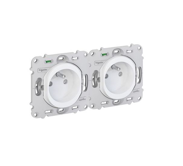Cette double prise de courant Ovalis, de la marque Schneider Electric, est un mécanisme servant à alimenter les appareils électriques d’un habitat. Elle possède 2 prises bipolaires avec terre. Ce mécanisme peut acheminer un courant d’alimentation de 16 A, avec une tension nominale de 250 V. Cette double prise de courant est à fixer directement dans un boîtier d’encastrement d’un entraxe de 71 mm à l’aide de vis ou de griffes. Elle est dotée de bornes sans vis pour assurer son raccordement avec le circuit électrique du secteur. Ce mécanisme est livré sans plaque de finition pour faciliter son adaptation avec la couleur du mur sur lequel elle est à installer.
