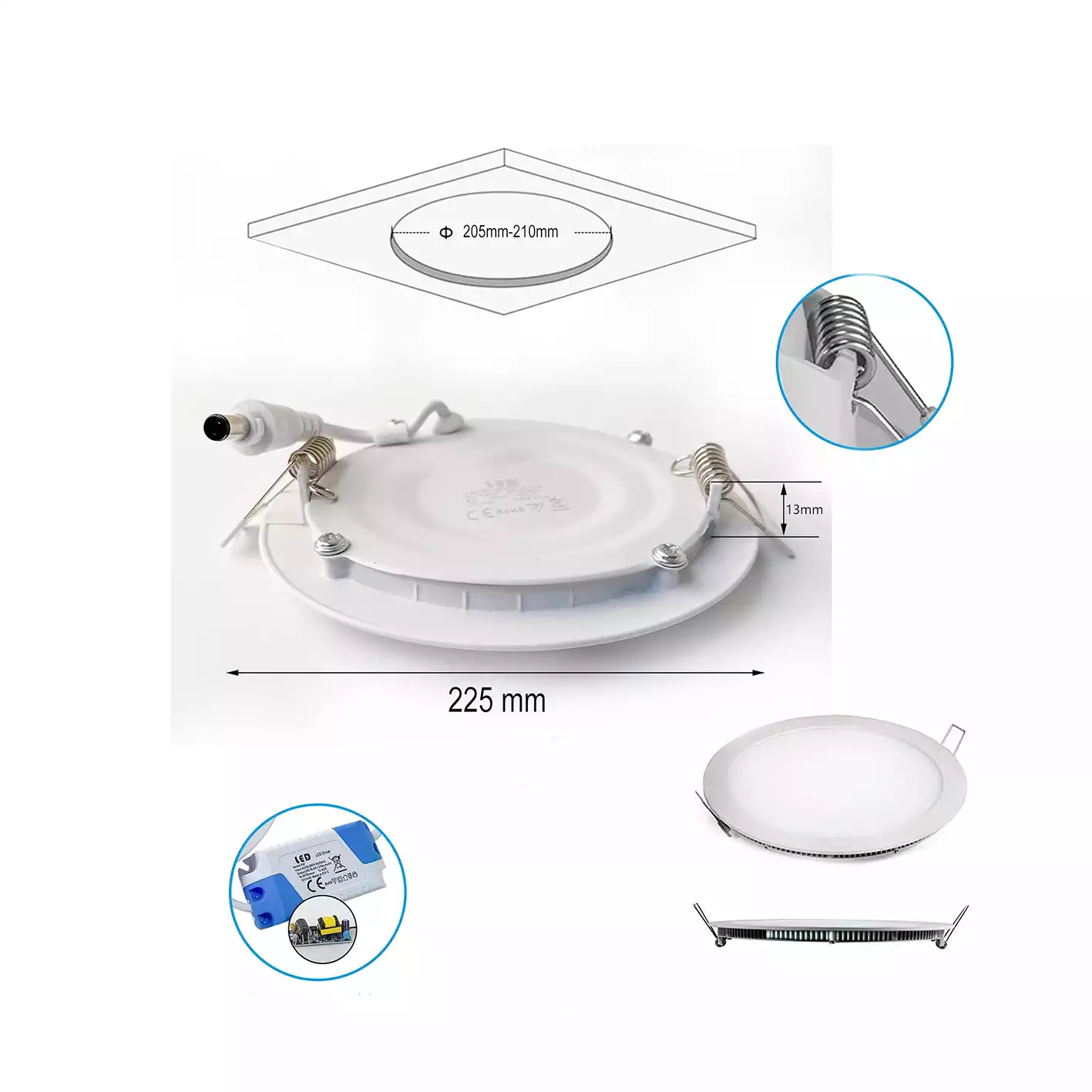 Downlight Saillie Rond 18W 6K 4000k 1600Lm IP20 Ø225x40mm ,【Conception intégrée extra plat mince】: Extra plat mince: 13mm/0,51in, ce spot encastré présente un design mince qui s’adapte aux espaces étroits plus facilement que les downlights encastrés traditionnels. Le transformateur accessoire permet une connexion directe à l’alimentation électrique de 230V et dispose d’un kit en alliage d’aluminium pour une meilleure dissipation de la chaleur et une utilisation sûre. 【Module LED de haute qualité】: Plafonnier à panneau LED 18W Blanc frois, température de couleur: 4000K, non dimmable, n’irrite pas les yeux, meilleure protection des yeux. Et plus, Équivaut à une ampoule halogène de 5 watts, Économisez jusqu’à 90% sur les factures d’électricité par rapport aux lampes halogènes traditionnelles; durée de vie supérieure à 53 800 heures. 【Facile à Installer】: Équipé de bornes pour fils, il peut être connecté en toute sécurité aux fils sans opérations compliquées. Équipé d’un connecteur, il est pratique de connecter directement l’alimentation, ce qui rend l’installation simple et sûre. 【Environnements des applications】: La conception générale est simple et élégante, ce qui convient très bien à l’éclairage intérieur comme les cuisines, les salons, les chambres, les escaliers, les couloirs, les hôtels, les bureaux, les salles de réunion, les restaurants, le grand magasin et de nombreux autres endroits où vous avez besoin d’un plafonnier lumineux. 【2 ans de garantie】: Excellente qualité et 2 ans de garantie. Tous nos ampoules LED sont en garantie de 2 ans. Et la satisfaction de nos clients est importante pour nous – si vous avez des problèmes ou des commentaires, nous attendons votre message avec impatience.