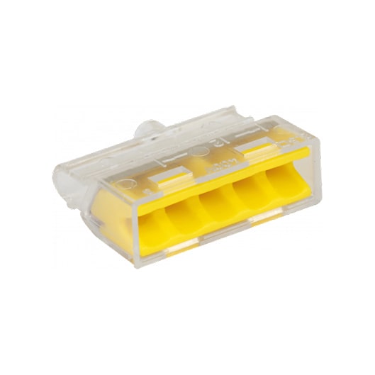Ces bornes de connexion rapide – 5 entrées de la marque Eur’ohm avec son design transparent rendent la mise en œuvre et l’insertion des fils très faciles.