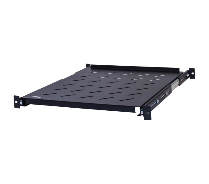 Plateau coulissant ajouré 19 » – 4 points de fixations (4 montants) – NOIR (RAL9005) – Hauteur 1U –