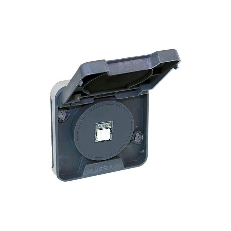 il sert à connecter un appareil multimédia comme un ordinateur, une télévision ou un routeur. Elle est, généralement, utilisée pour la connexion Ethernet, mais elle permet aussi de transmettre des données informatiques. Avec des câbles RJ45 de catégorie 6 FTP, cette prise est capable de transmettre des données à des fréquences de 500 MHz et à des débits théoriques de 1 Gb/s. Elle a un volet pouvant être fermé assurant une protection contre les jets d’eau ou la poussière.